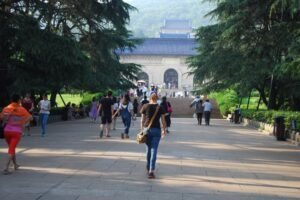 Anyhow we arrived at our hotel in Nanjing and after due deliberation with the town map we realised there were really far too many interesting places to visit and we had less than a day and a half, 2 half days more like. I think we fitted so much into this day and a half that I hope I can remember everything and in the right order. We’d drawn circles round a few places and had decided to head out first to see Sun Yat Sens Mausoleum, The Ming Temple and the lovely grounds they were both set in. These were within ‘short’ distances of each other and were only going to be a few stops away on the Metro. I think this is when we found a pizza place to eat lunch on the way to catch the train, we drew the line at McDonalds and afterwards I had difficulty with finding a toilet in a shopping centre! Well Renee waited outside with my bag while I went to find a toilet. However finding my way back down and out to the same entrance proved a trial, escalators up but not down in the same place, and on finally exiting I found myself in a very same, identical looking entrance and forecourt but no Renee. And no handbag with phone in it to call her, where had she ### gone! It took me a quite few minutes to realise that actually I was outside the wrong entrance, rounded the corner and there she was, another ½ hr wasted (by me, I know!)