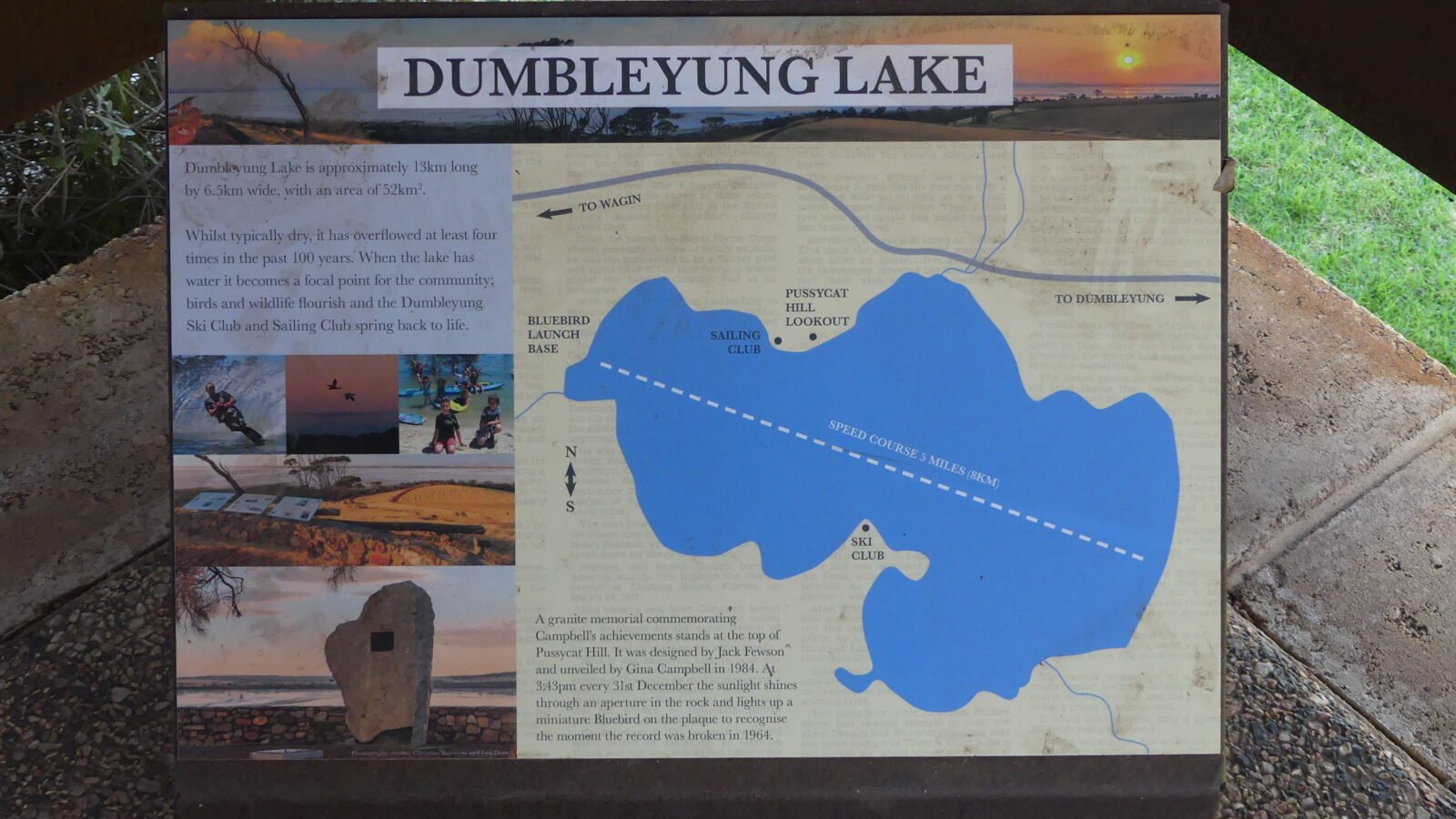 Dumbleyung, in modern times, is best remembered as the site, at the Lake, of Donald Campbells World Water Speed Record in 1964 at 277.63mph (475.2kph) – the current record is 511.11 km/h (317.59 mph), achieved by Australian Ken Warby in the Spirit of Australia in 1978, the 2 attempts to better it have resulted in fatalities, Lee Taylor (1980) and Craig Arfons (1989).