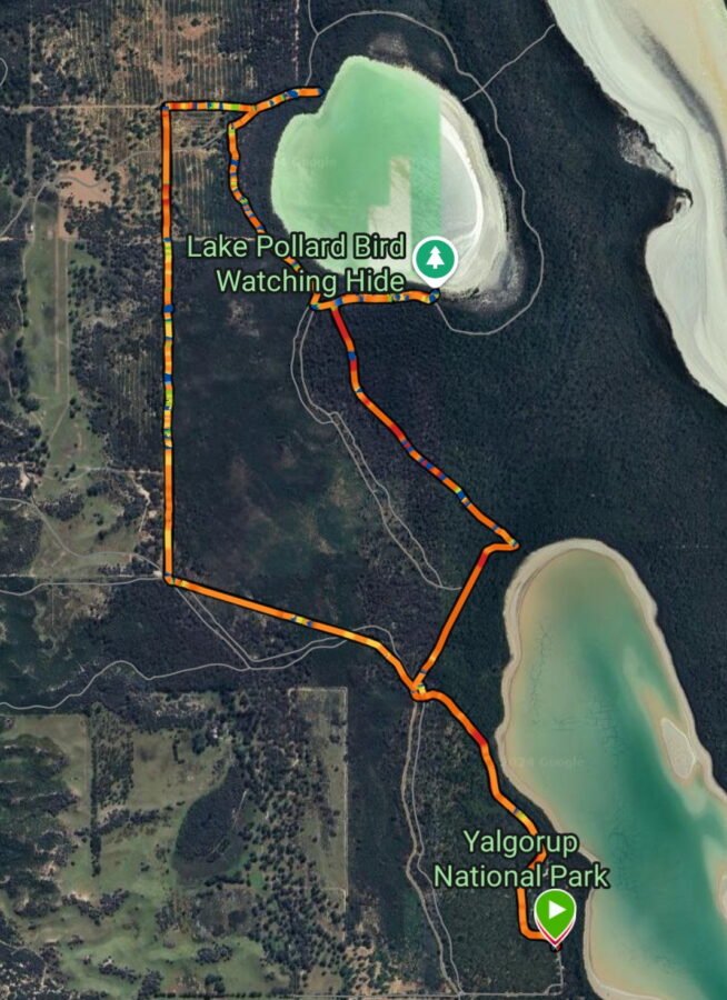 Lake Pollard is to the North of Martins Tank Lake and all within the Yalgorup National Park; a walking trail leads to a bird hide and around the edge of the National Park and adjoining forest reserves and a private property.
