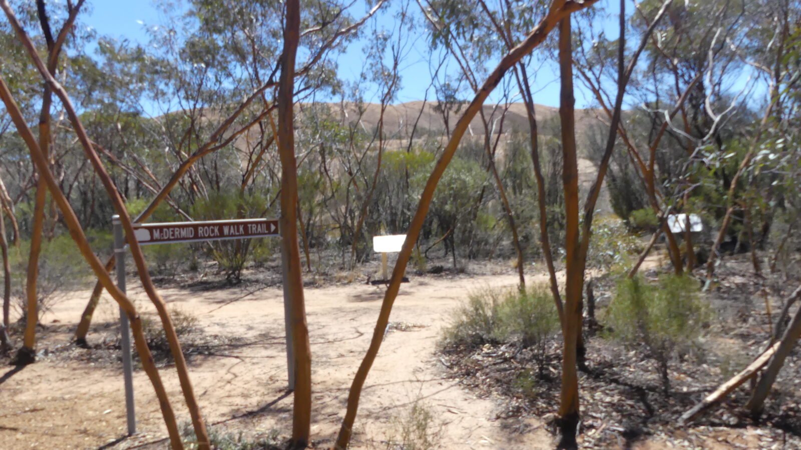 Driving the distance of only 7km took us to McDermid Rock, our next stop and walk/climb along the Golden West Discovery Trail. A small camping area, but not as small as some, has a toilet and tables and is right next to the rock, the walking trail starting about 50m from our van.