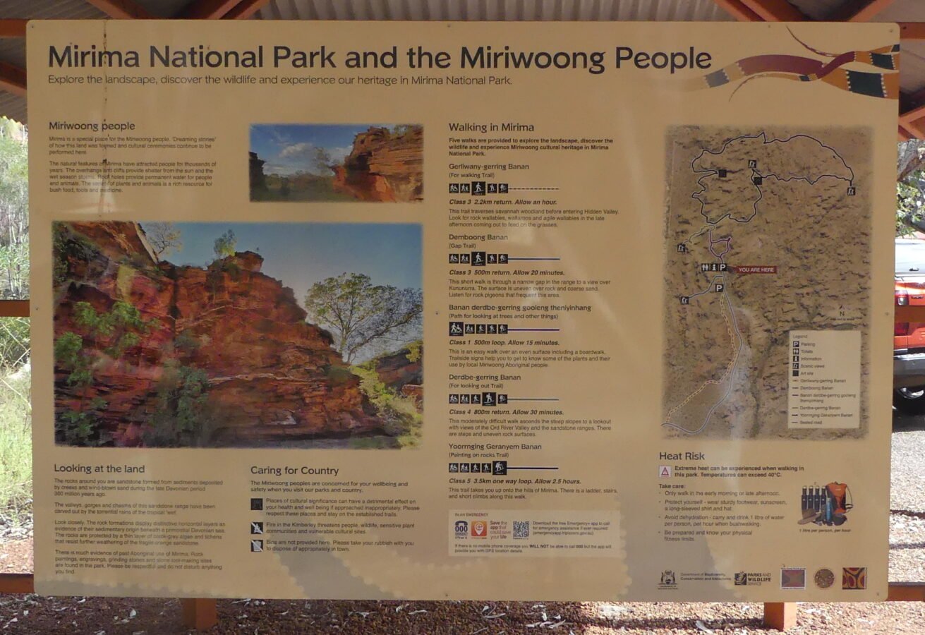 The Mirima National Park , also known as Hidden Valley, begins at the very edge of the town of Kununurra and covers just over 20 square kilometres. The centre of the area is the “Hidden Valleys” walking trail, the Yoorrming Geranyen Trail , a 4km loop that takes around 2.5 hours to complete..