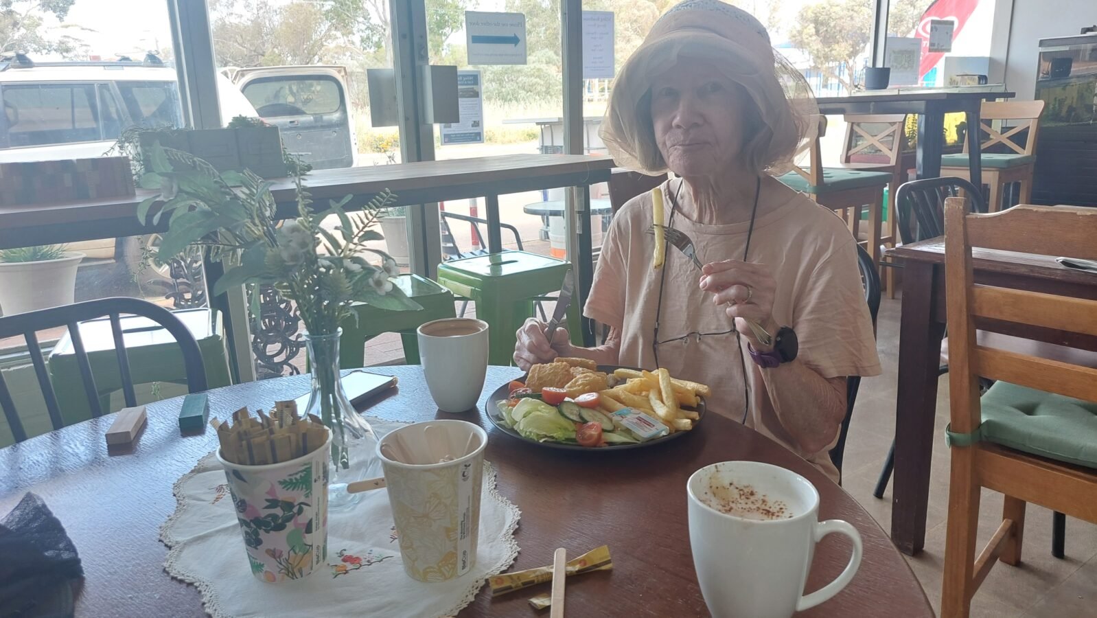 Arriving around lunchtime at the local Caravan Park at the sports ground we walked to the Roadhouse for a great lunch of Fish ‘n Chips and salad.